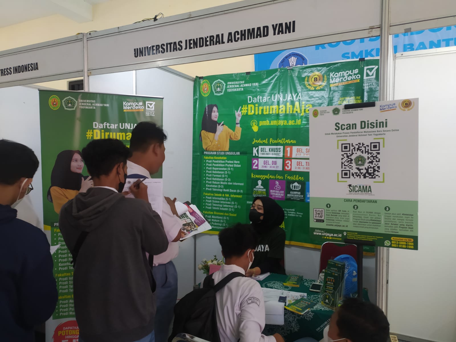 BANTUL – Universitas Jenderal Achmad Yani Yogyakarta (UNJAYA) berpartisipasi dalam kegiatan job dan edu fair SMKN 1 Bantul yang dilaksanakan pada Selasa (24/05/2022) bertempat di Aula SMKN 1 Bantul job dan edu fair SMKN 1 Bantul dihadiri oleh Kabid Dikmen Disdikpora DIY, Dra Isti Traisih dan 22 Perguruan Tinggi Negeri maupun Swasta. Salah satunya adalah UNJAYA yang ikut berpartisipasi dalam kegiatan ini. UNJAYA hadir untuk memberikan informasi terkait penerimaan mahasiswa baru, beragam beasiswa dan mengenalkan program studi yang ada di UNJAYA. Minat siswa untuk lanjut pendidikan cukup tinggi dibuktikan dengan banyaknya siswa yang berkunjung ke stand UNJAYA.